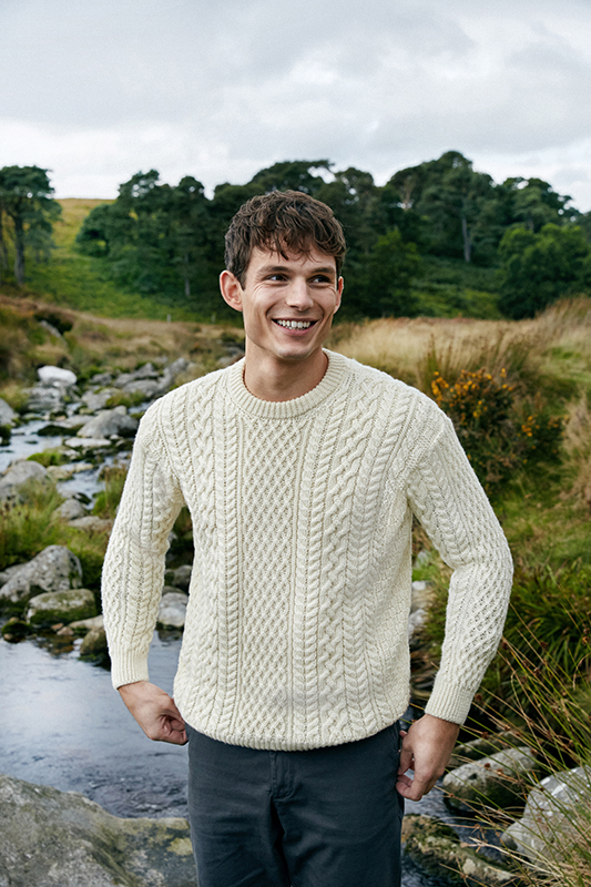 A classic Aran sweater with a distinctive honeycomb pattern that adds depth and texture. The straight, slightly looser, boxy fit makes it comfortable and versatile, while the traditional knit details emphasize its artisanal heritage.