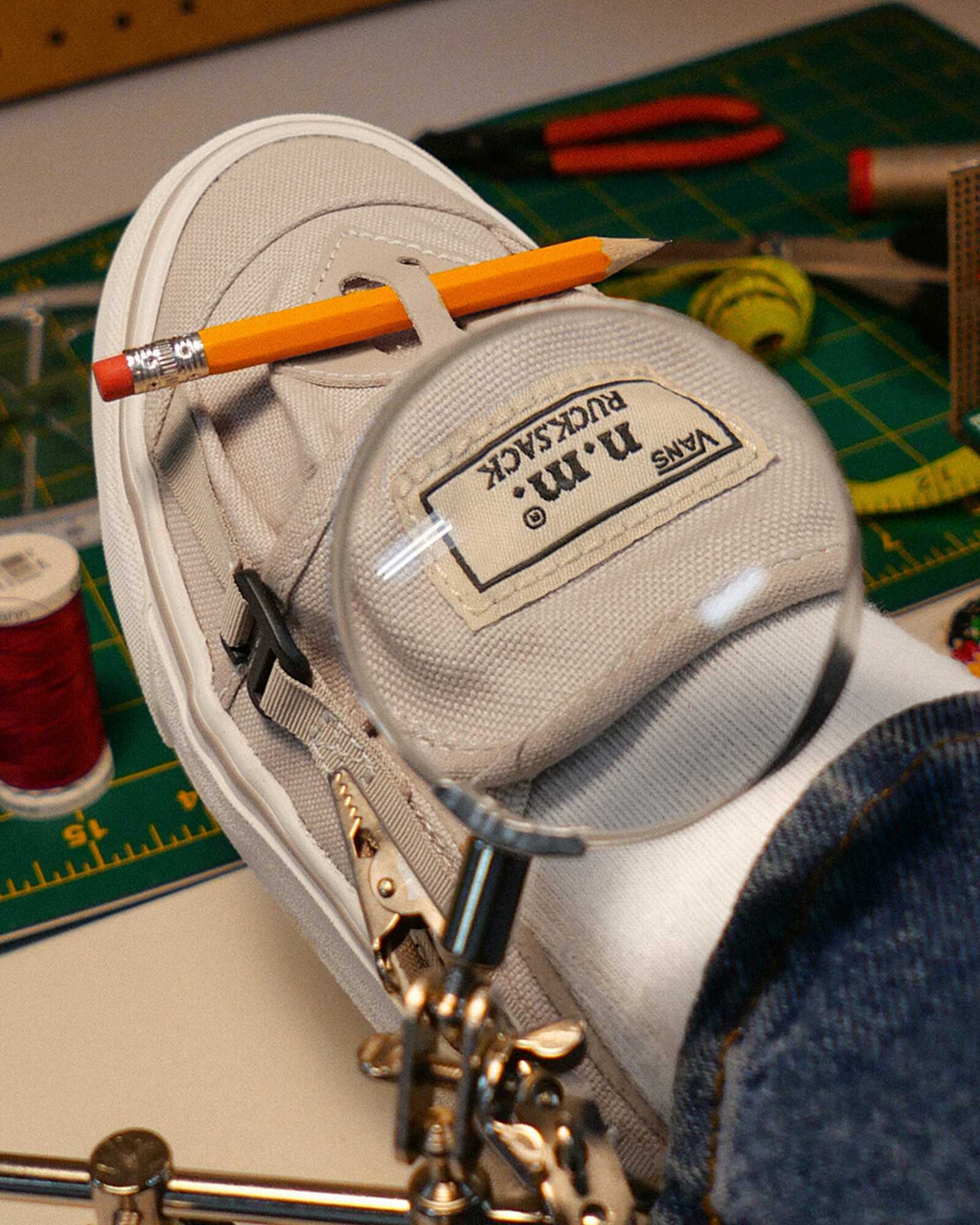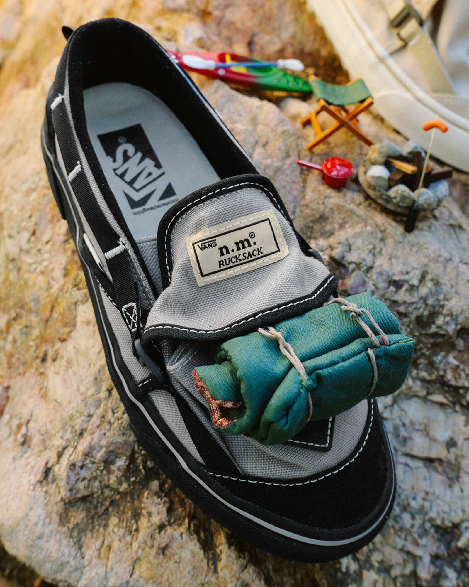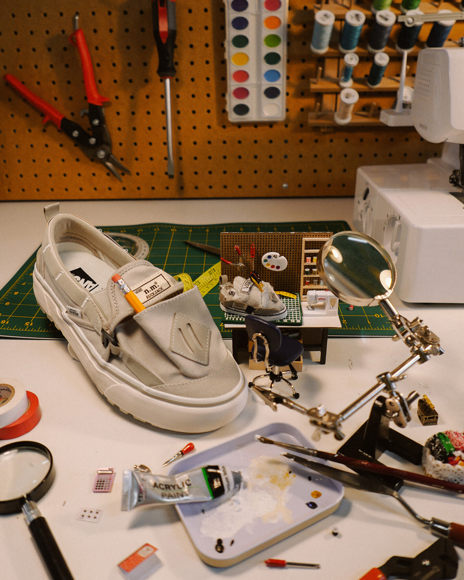 Dripping with wit, the Vans x Nicole McLaughlin campaign showcases the collection through a mini series of tiny replicas of real-life objects. Going off-grid, the Vans x Nicole McLaughlin Slip-On RS is unpacked with tiny items from the shoe’s pockets to set up camp. The collection is also presented in a downsized version of Nicole’s atelier, redefining the unexpected ways she tailors to her creative process and DIY approach. The campaign was shot and styled by Nicole McLaughlin.