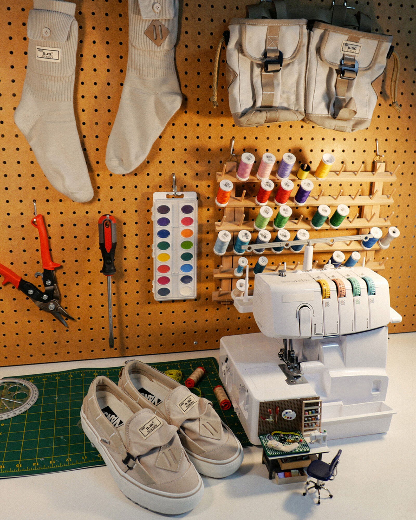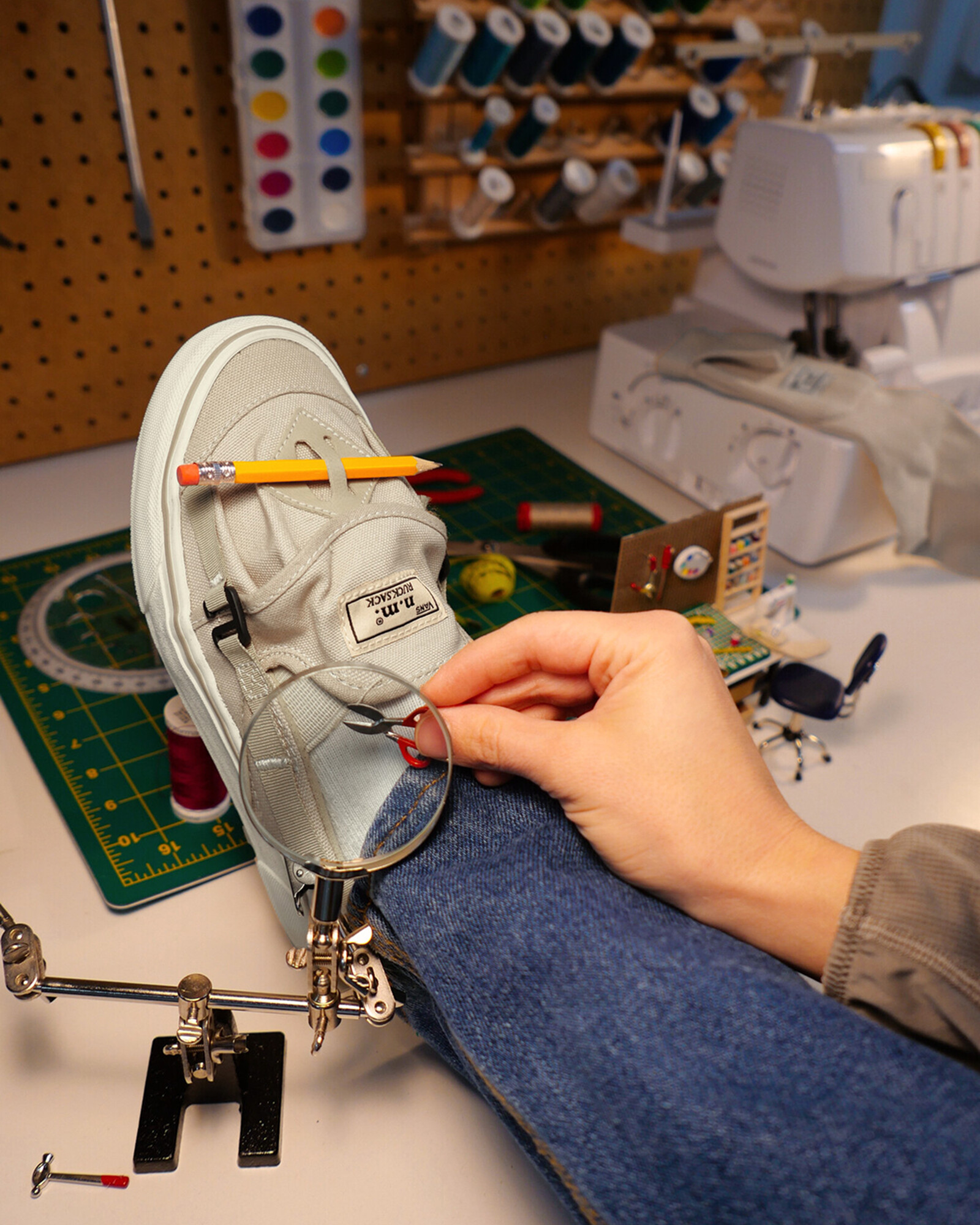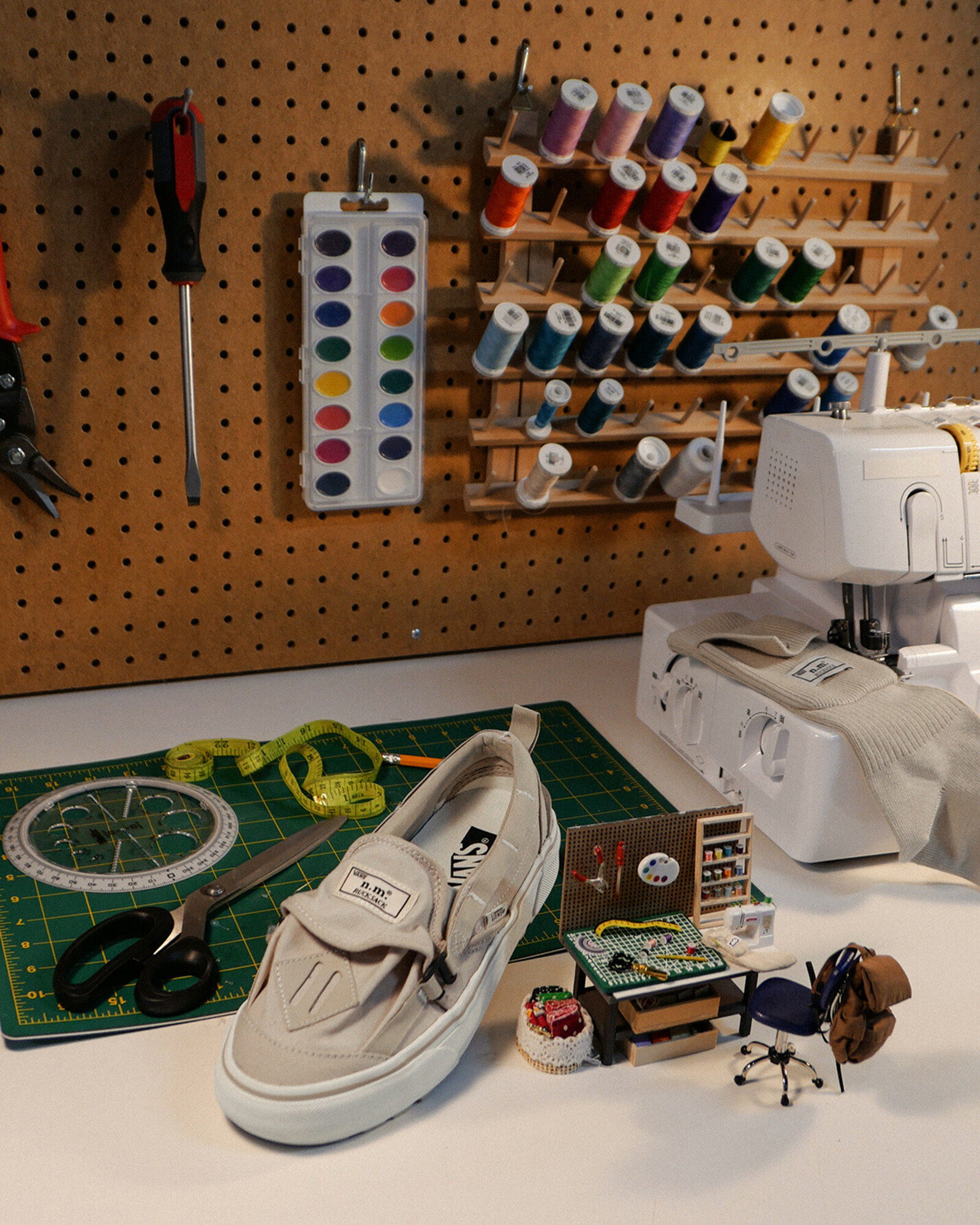 Dripping with wit, the Vans x Nicole McLaughlin campaign showcases the collection through a mini series of tiny replicas of real-life objects. Going off-grid, the Vans x Nicole McLaughlin Slip-On RS is unpacked with tiny items from the shoe’s pockets to set up camp. The collection is also presented in a downsized version of Nicole’s atelier, redefining the unexpected ways she tailors to her creative process and DIY approach. The campaign was shot and styled by Nicole McLaughlin.