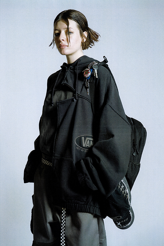 Utilitarian design in fashion emphasizes functionality and durability, often drawing from uniforms, military gear, and industrial workwear. Here, the result is a kind of uniform the badolescents of Larry Clark’s Ken Park might wear today.
