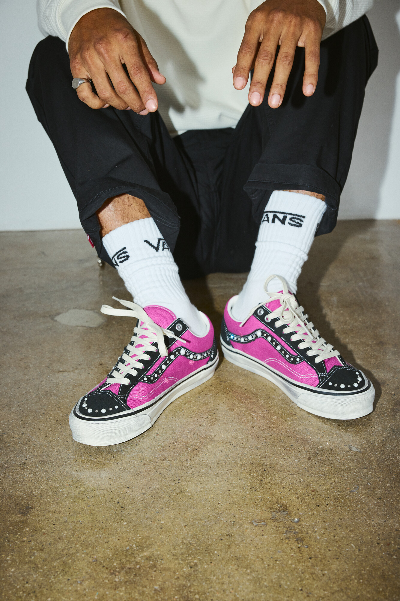 The OTW Old Skool 36 Pearlized features pearl and crystal embellishments along a distressed upper, emulating a well-loved shoe that has been repaired and customized along the way as it has traveled to many destinations.