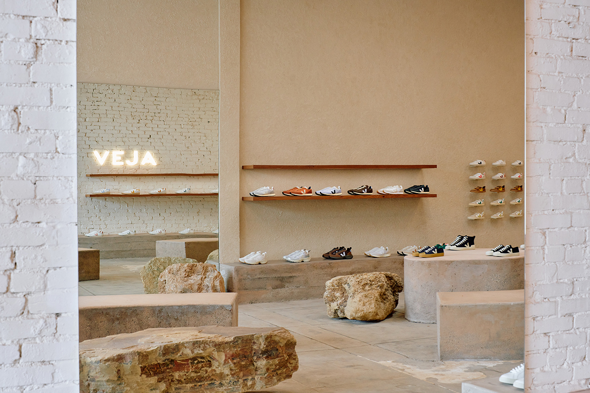 Tucked away in a historic building that once housed a small neighborhood shop, the new VEJA store seamlessly blends past and present. In a nod to the location’s heritage, the original “Carnation” sign still adorns the façade — a nostalgic marker that locals instantly recognize. Eschewing the flashy aesthetics often associated with American retail, the space embraces a sense of authenticity and connection, fully rooted in the spirit and rhythm of the neighborhood.