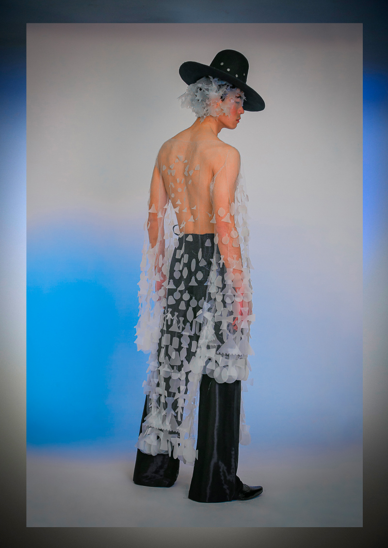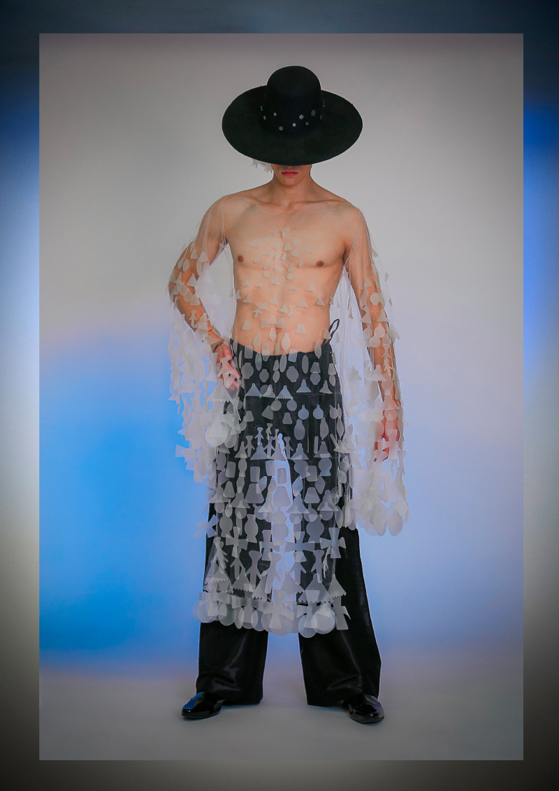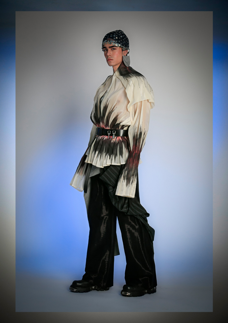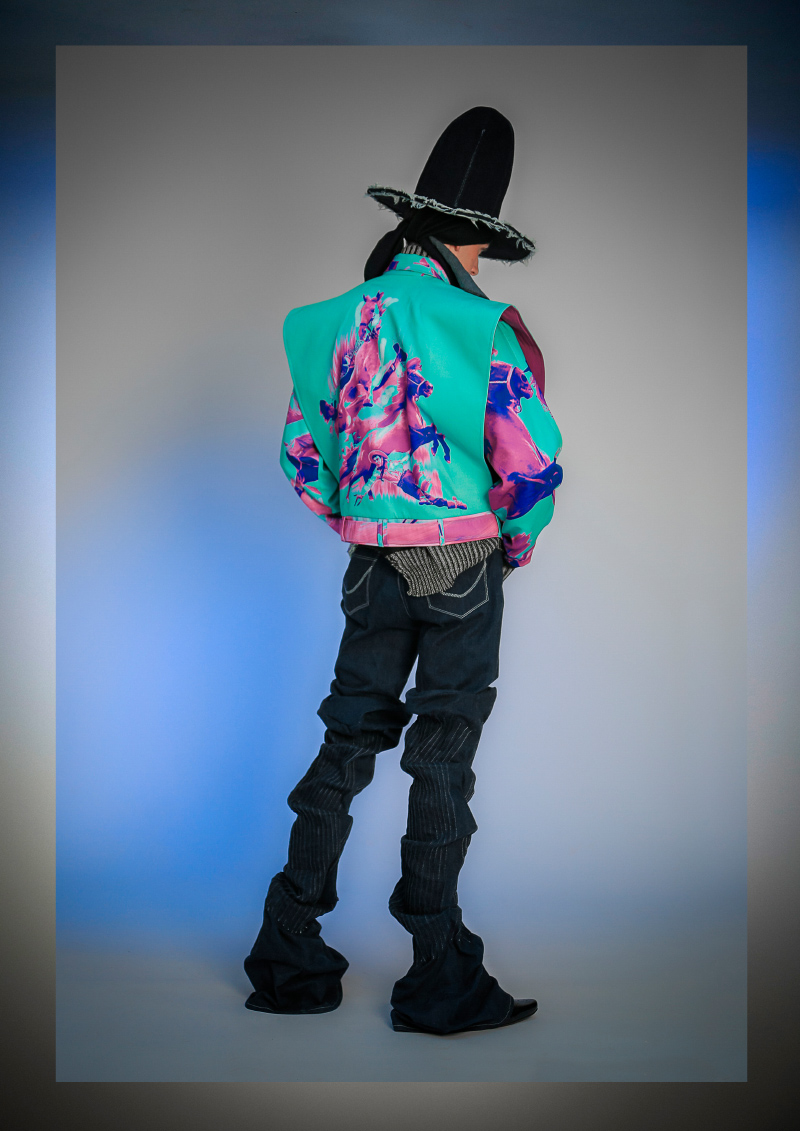 “This collection was born from the fusion of two diametrically opposed elements: the rigid masculinity of the South American cowboys – the gauchos – and the extravagance of the club kids and the generations that have followed them to this day. The gaucho, a mestizo by origin, is the perfect example of the fusion of European colonialism in indigenous lands, so much so that his wardrobe is a mixture of indigenous (Quechua) and European clothing. This ambiguity is the cornerstone of the collection. Thus, there are contrasting elements that are combined into one, such as the hybridisation of skirt and trousers in the «chiripas». The jewels of the Mapuche people (indigenous people of southern Chile) serve as inspiration and give shape to the dresses and accessories. Finally, the collection also aims to take a critical look at the toxic masculinity of «machos» in Latin America and to shake up the installed normativity.”