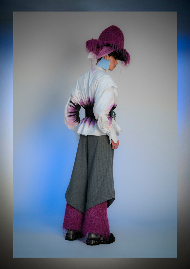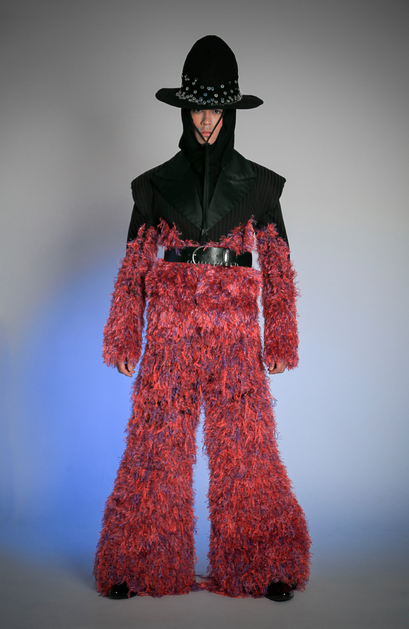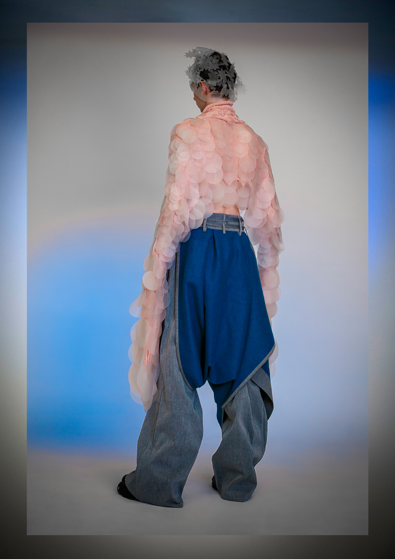 “This collection was born from the fusion of two diametrically opposed elements: the rigid masculinity of the South American cowboys – the gauchos – and the extravagance of the club kids and the generations that have followed them to this day. The gaucho, a mestizo by origin, is the perfect example of the fusion of European colonialism in indigenous lands, so much so that his wardrobe is a mixture of indigenous (Quechua) and European clothing. This ambiguity is the cornerstone of the collection. Thus, there are contrasting elements that are combined into one, such as the hybridisation of skirt and trousers in the «chiripas». The jewels of the Mapuche people (indigenous people of southern Chile) serve as inspiration and give shape to the dresses and accessories. Finally, the collection also aims to take a critical look at the toxic masculinity of «machos» in Latin America and to shake up the installed normativity.”
