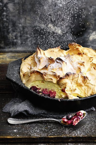 Den süßen Höhepunkt bilden Tiroler Schneenockerl: Heidelbeeren, Vanillepudding und luftiger Eischnee werden in der BBQ-Keramik-Backform gesch