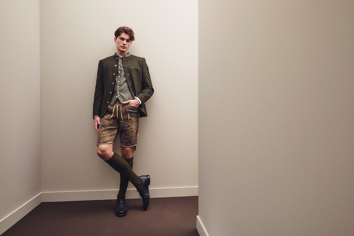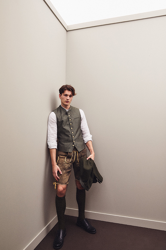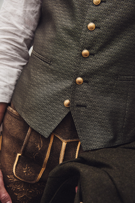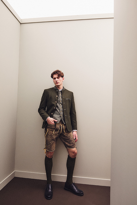 Janker und Westen aus Loden, Leinen und Jacquard stehen für eine charakterstarke Schnittführung und eine moderne Ästhetik. Der Janker folgt der windsor-typischen, halbgefütterten Verarbeitung und bringt mit seiner leichten Konstruktion eine moderne, reduzierte Interpretation traditioneller Trachten- Silhouetten. Die Westen setzen durch Materialkontraste und durchdachte Details Akzente. Ergänzt wird die Linie durch eine Lederhose aus Hirschleder mit grünen Stickereien sowie ein Stehkragenhemd mit schmaler Silhouette.