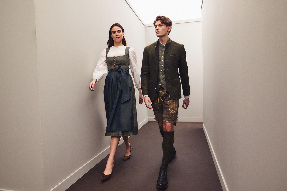 Zwei Dirndl-Designs stehen im Mittelpunkt der Damenlinie: Ein Modell mit Leinen-Mieder, Jacquard- Rock und goldenen Knöpfen strahlt subtile Raffinesse aus, während die Kombination aus Loden- Mieder, feinen Herzrüschen und dunkler Jacquard-Schürze eine feminin-verspielte Note hat. Der Janker greift die moderne Blouson-Silhouette auf und präsentiert sich in einer cropped Variante aus klassischem, bayerischem Loden – eine Neuinterpretation traditioneller Trachtenelemente. Dirndlblusen in zwei Varianten – eine hochgeschlossen, die andere mit lässiger Knopfleiste und 3⁄4- Ärmeln – runden die Linie ab.
