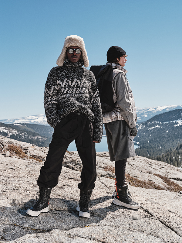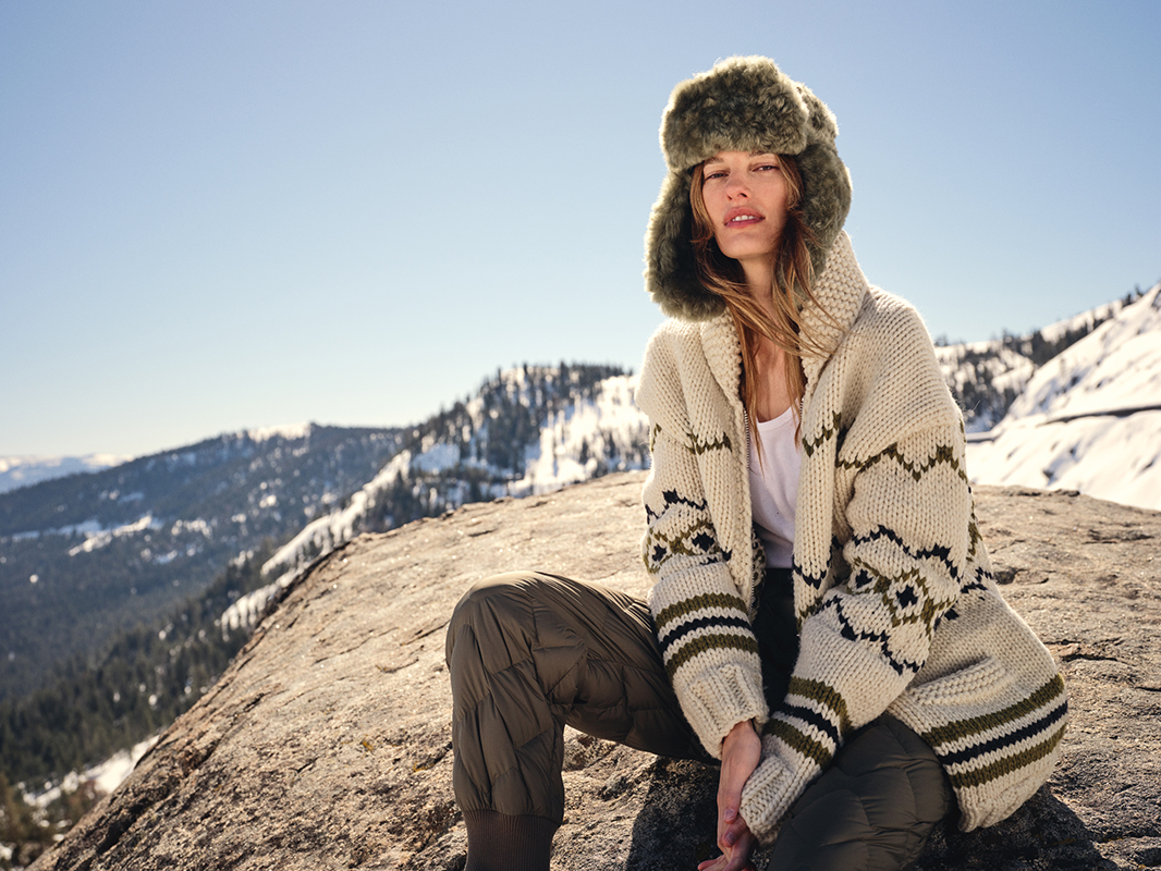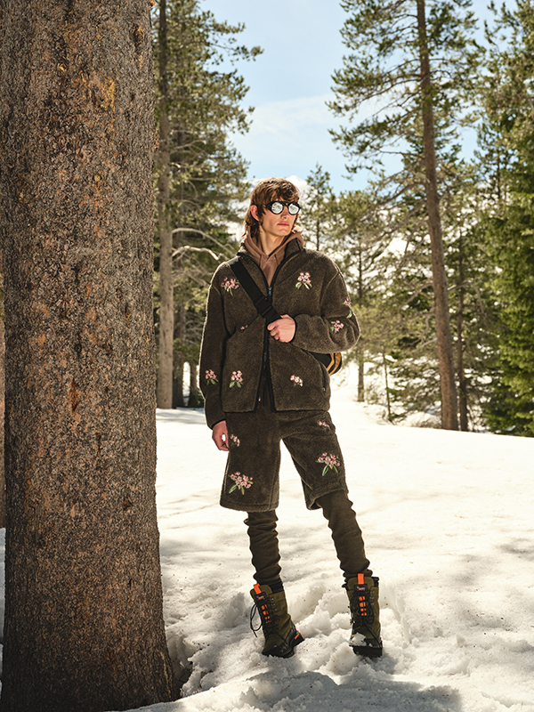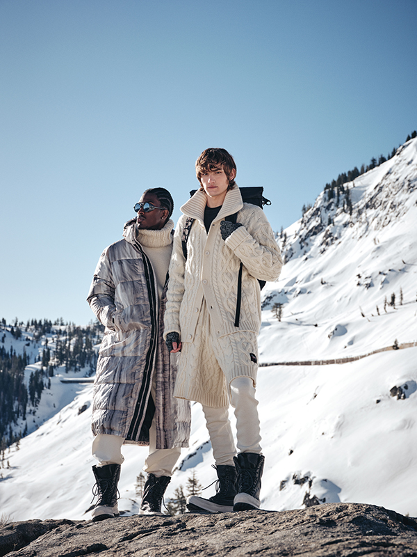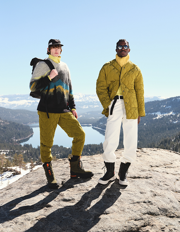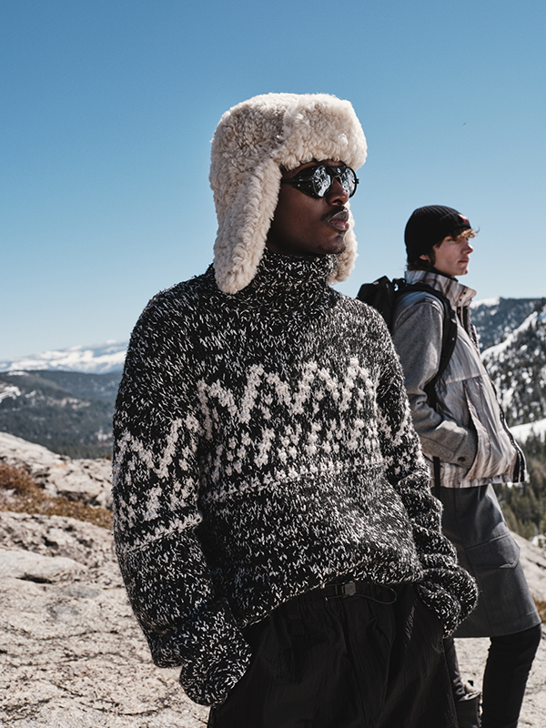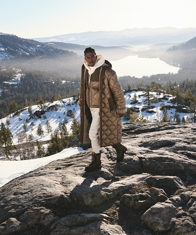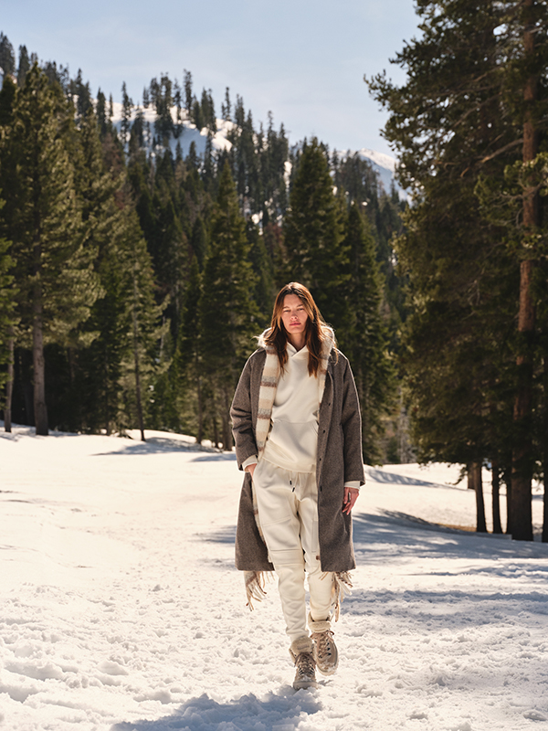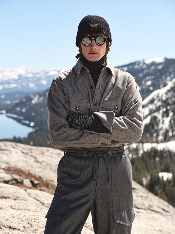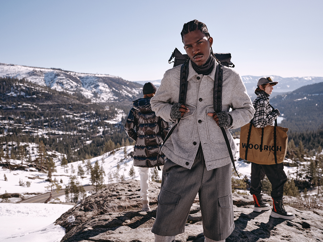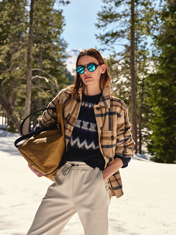 The backdrop of this narrative is nature—untouched, silent, and powerful. The looks come to life against the stunning landscape of Donner Summit, offering breathtaking views of the majestic Sierra Nevada range, just steps away from the iconic Lake Tahoe, known for its crystal-clear waters and its role in numerous cult films. This natural setting is the perfect canvas for a collection that seamlessly blends tradition and modernity, a nod to the brand’s roots. Woolrich has always drawn inspiration from these vast, wild landscapes. These settings capture not only the beauty of the natural world but also the raw energy of an environment that both challenges and inspires. “Let Nature Be Your Muse” is a dialogue between nature and fashion, where every element reflects a story of authenticity and expressive freedom.