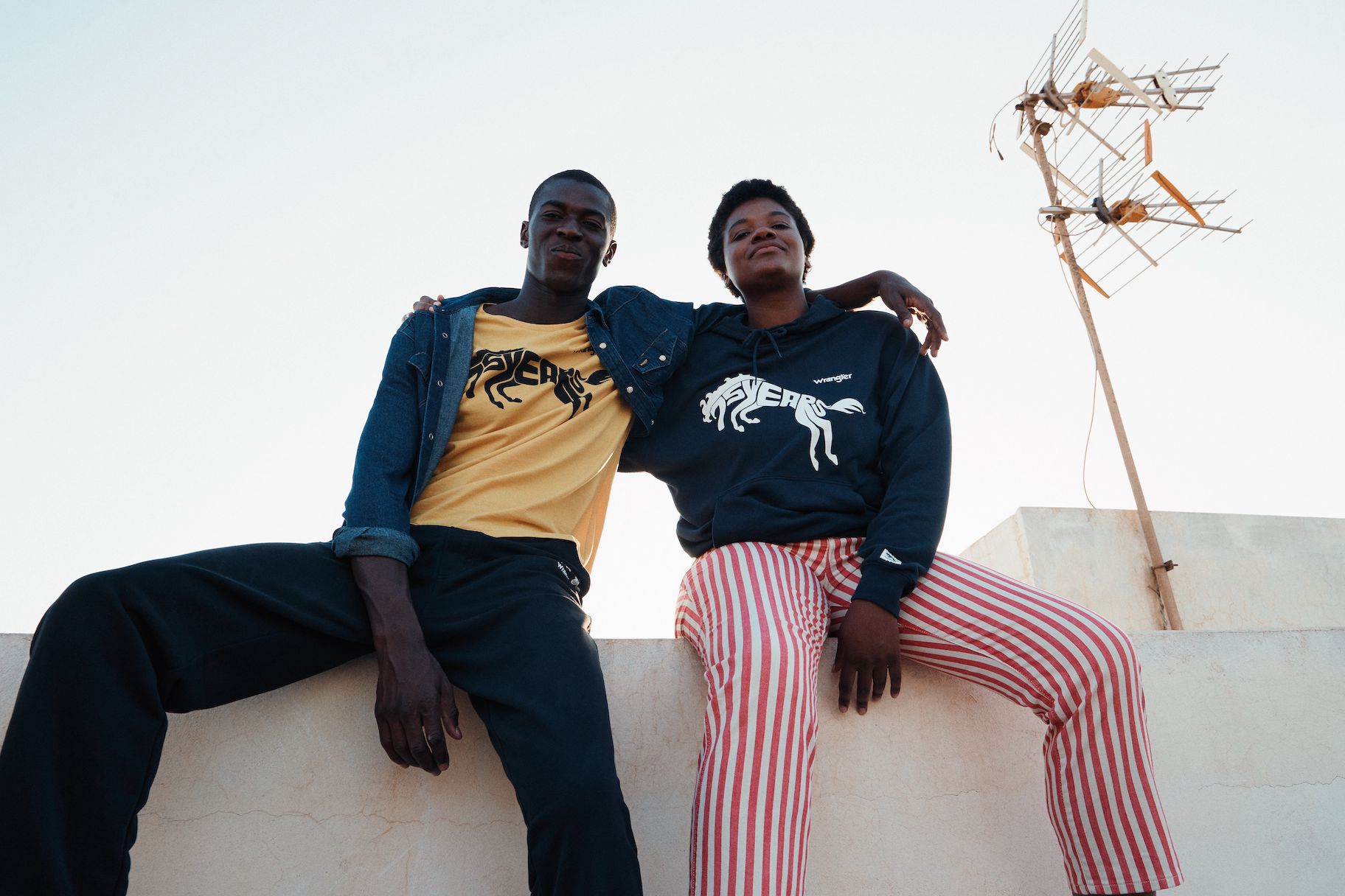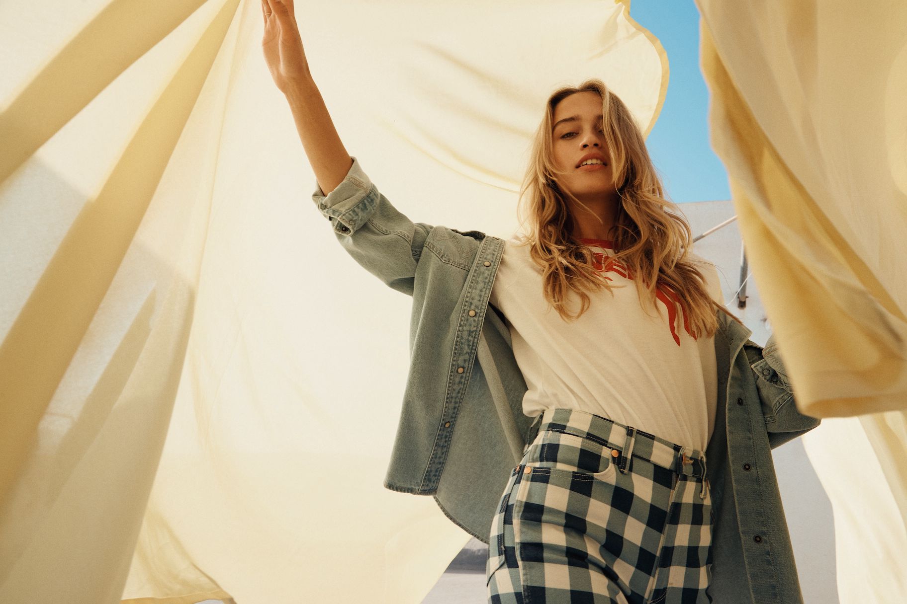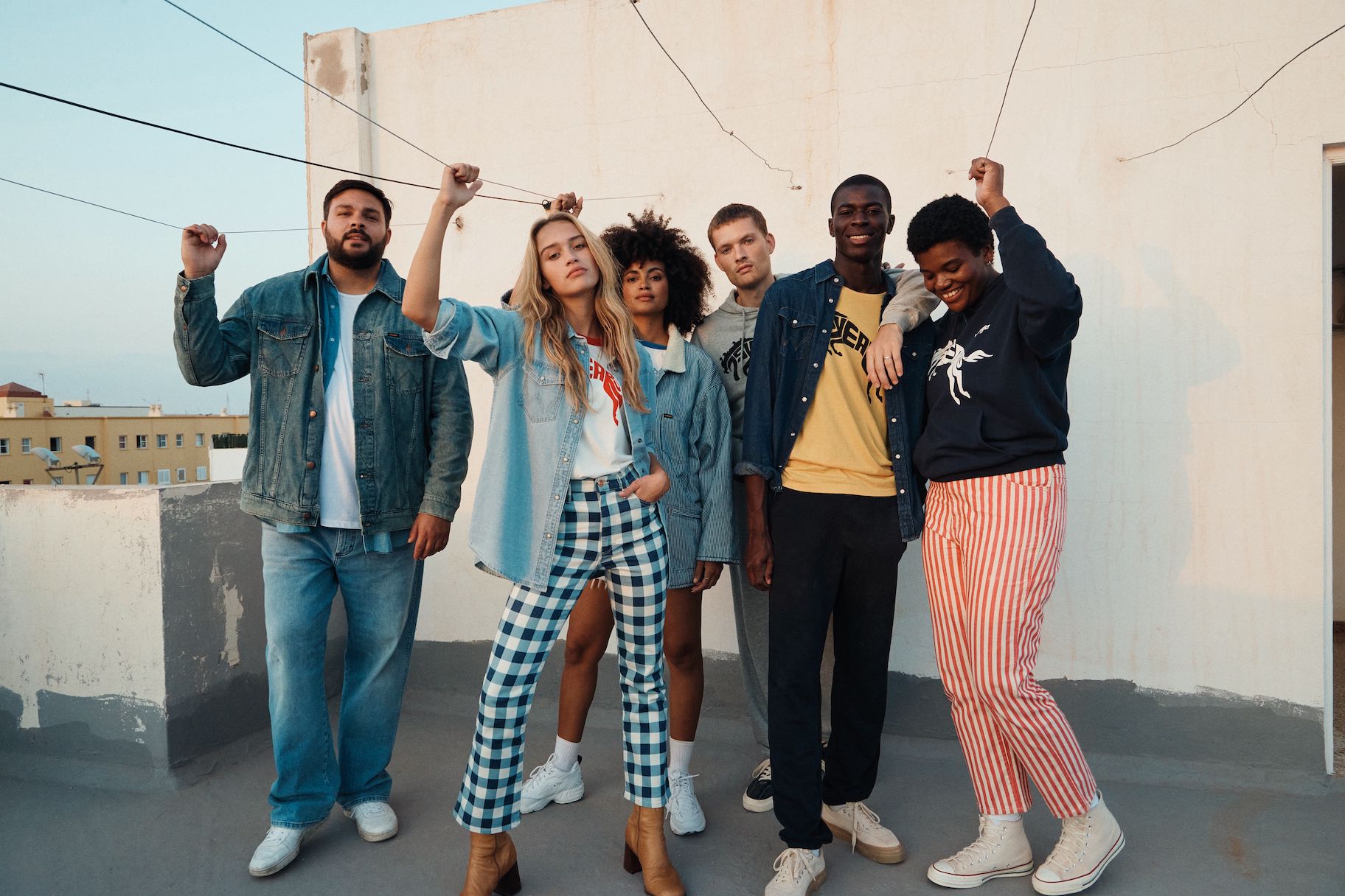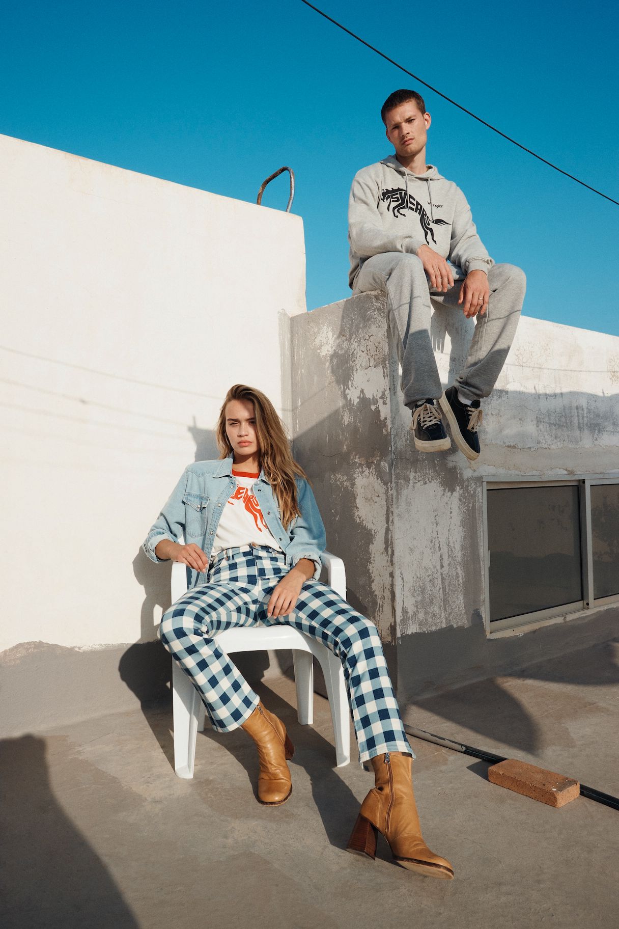 Das Motto ist selbstbewusst, frei und energetisch. T-Shirts, Hoodies und Joggers sind mit einem auffälligen Sonderlogo versehen, und die Farbpalette ist mit tiefen Rot-, Gelb- und Blautönen kräftig. Die archetypischen Hemden und Jacken in Denim von Wrangler überzeugen weiterhin als Klassiker. Verspieltheit und sonniger Optimismus finden sich in den bedruckten Denims für Damen wieder, mit Eiscreme-Streifen auf den Wild West-Jeans mit geradem Bein und auffälligen Karos auf der ausgestellten Silhouette der Wrock Fit. Eine Denim-Duvet-Jacke sorgt für einen saisonalen Übergangsstil, während Jeans-Shorts in A-Linie einen Hauch von Sommer versprühen. Bei den Herren sorgt die Anti-Fit-Jacke mit überschnittenen Schultern und verlängerten Ärmeln für einen modernen Oversized-Look.