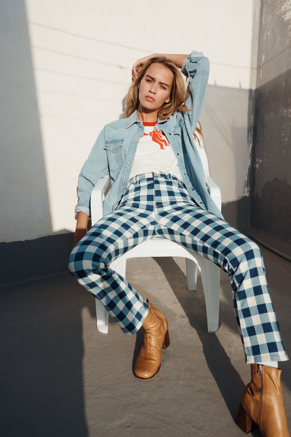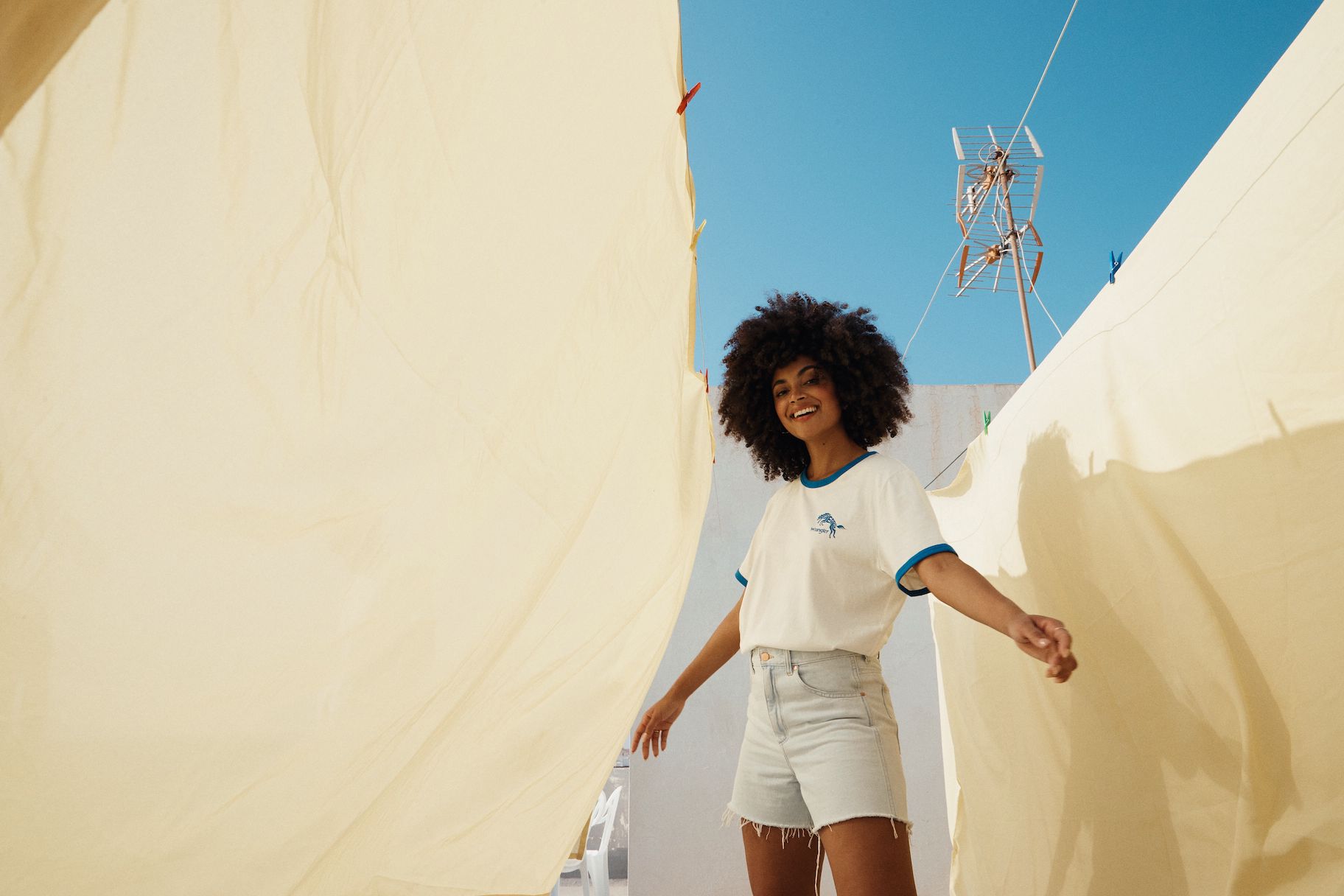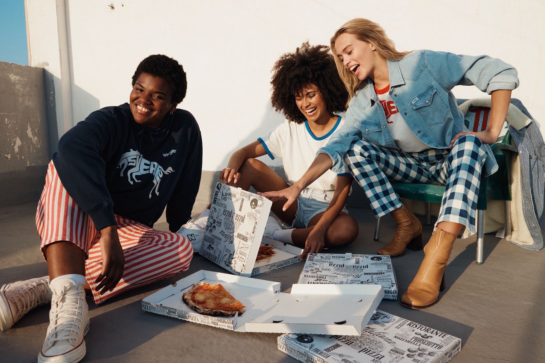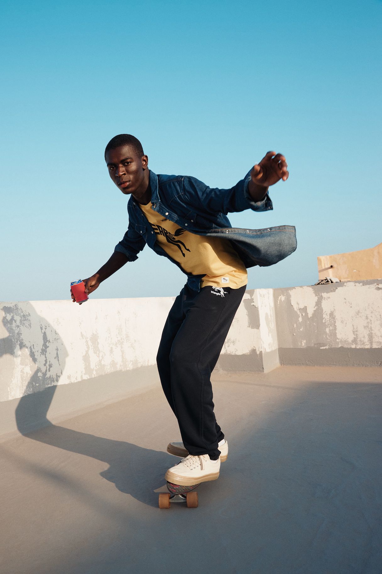 Das Motto ist selbstbewusst, frei und energetisch. T-Shirts, Hoodies und Joggers sind mit einem auffälligen Sonderlogo versehen, und die Farbpalette ist mit tiefen Rot-, Gelb- und Blautönen kräftig. Die archetypischen Hemden und Jacken in Denim von Wrangler überzeugen weiterhin als Klassiker. Verspieltheit und sonniger Optimismus finden sich in den bedruckten Denims für Damen wieder, mit Eiscreme-Streifen auf den Wild West-Jeans mit geradem Bein und auffälligen Karos auf der ausgestellten Silhouette der Wrock Fit. Eine Denim-Duvet-Jacke sorgt für einen saisonalen Übergangsstil, während Jeans-Shorts in A-Linie einen Hauch von Sommer versprühen. Bei den Herren sorgt die Anti-Fit-Jacke mit überschnittenen Schultern und verlängerten Ärmeln für einen modernen Oversized-Look.