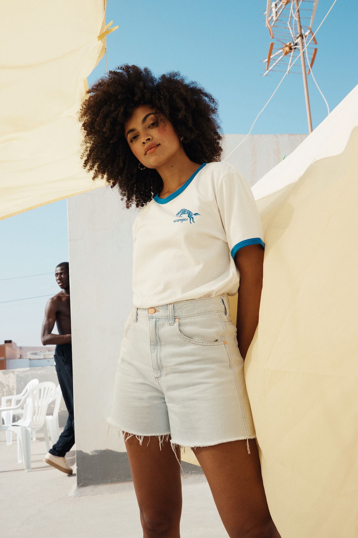 Diese Jubiläums-Kollektion, die noch vor der neuen Hauptkollektion auf den Markt kommt, gibt eine erste Richtung vor, die Wrangler im Frühjahr/Sommer 22 einschlägt: eine ausgelassene Stimmung, sowie eine fröhliche Farbpalette, die auf den Sommer einstimmen.