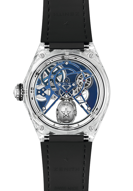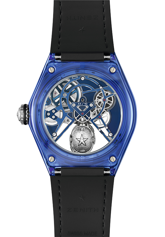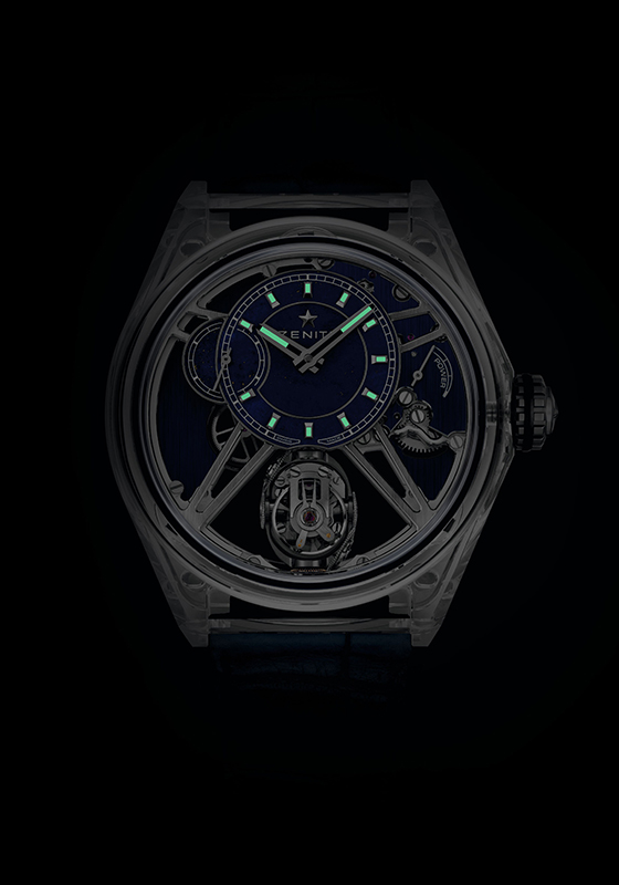Continuing the anniversary theme, the offset hours, minutes and small seconds appear on a lapis lazuli dial with luminescent faceted hour markers. The deep blue dial, flecked with gold-colored pyrite, evokes a starry sky, and thanks to its natural texture, each watch is unique. The 50-hour power reserve is indicated at 3 o’clock. Visible on both sides, the skeletonized manual-winding El Primero 8812S calibre contrasts strikingly with the slim, star-evoking bridges in a light tone. Its openworked architecture offers a captivating perspective on the Zero Gravity module at 6 o’clock, which rotates to remain in a horizontal position as the watch moves. Its silicon escapement wheel is paired with a nickel-silicon anchor, while the balance wheel features a double-arrow regulator—a nod to the design of ZENITH chronométrier Charles Fleck. As a double guarantee of extreme precision, the El Primero 8812S calibre beats at a fierce pace of 5Hz. Finally, the module’s counterweight surface is engraved to recall a celestial body.